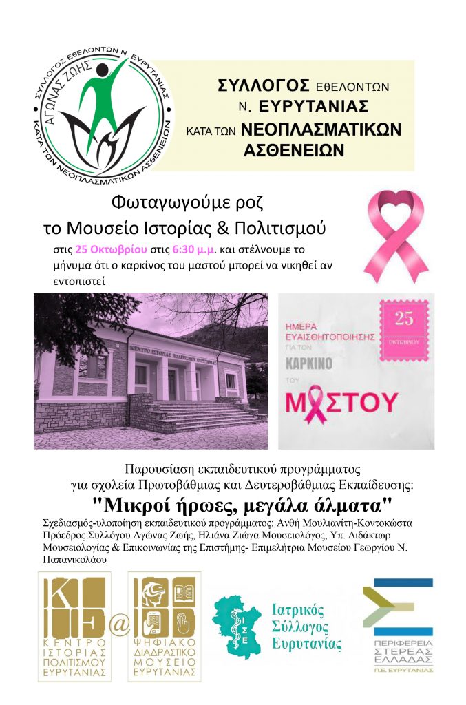 Άλλη μία δράση ενημέρωσης και ευαισθητοποίησης θα πραγματοποιηθεί την Τετάρτη 25 Οκτωβρίου από τον Σύλλογο Εθελοντών Ν. Ευρυτανίας κατά των Νεοπλασματικών Ασθενειών ‘‘Αγώνα Ζωής’’. Με αφορμή την Παγκόσμια Ημέρα Πρόληψης για τον καρκίνου του μαστού στις 6:30 μ.μ. το Καρπενήσι θα στείλει το μήνυμα ότι ο καρκίνος του μαστού μπορεί να νικηθεί αν εντοπιστεί έγκαιρα και για αυτό τον λόγο το ΚΙΠΕ θα φωταγωγηθεί ροζ.
