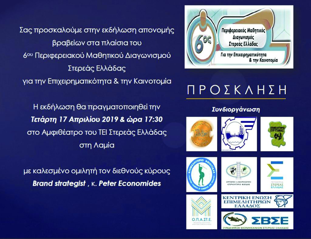 Τετάρτη 17/4/2019 στη Λαμία (Αμφιθέατρο ΤΕΙ) Απονομή βραβείων του 6ου Μαθητικού Περιφερειακού Διαγωνισμού Στερεάς για την Επιχειρηματικότητα & και την Καινοτομία. Συμμετέχει το Επιμελητήριο Ευρυτανίας | Ώρα 17.30 μ.μ.