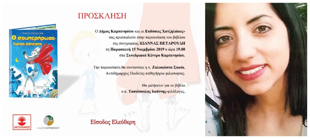 Ο σούπερ ήρωας Αστέρης, είναι ένας λύκος διαφορετικός από τους συνηθισμένους, με γεμάτη καλοσύνη καρδιά, που όταν κάποιος έχει την ανάγκη του, φοράει την κόκκινη κάπα και πετάει σαν σίφουνας ,για να τον βοηθήσει. Το ίδιο έκανε και για τον Γιαννάκη, που δεν ήθελε να πάει στο σχολείο, εξαιτίας κάποιων νταήδων συμμαθητών του. Κι όμως, ο Αστέρης, με τον τρόπο του και τις συμβουλές του, τον έκανε να ξεπεράσει το πρόβλημα και να ξαναγυρίσει ήρεμος πια στο σχολείο. Το όμορφο παραμύθι, που μιλάει για το bullying, το τόσο σημαντικό πρόβλημα της εποχής μας και προτείνει τρόπους για την αντιμετώπιση του, είναι το πρώτο συγγραφικό εκπόνημα της νεαρής Καρπενησιώτισσας Ιωάννας Πεταρούδη. Η Ιωάννα γεννήθηκε και μεγάλωσε στο Καρπενήσι και όπως χαρακτηριστικά δήλωσε: ‘‘Η έμπνευση μου αφορά το πρώτο μου παραμύθι, στο οποίο γεννήθηκε ο ήρωας, μου ο οποίος ακουμπά τα συναισθήματα μικρών και μεγάλων και στην πορεία με την αφορμή του λύκου του Αστέρη θα ακολουθήσουν και καινούργιες ιστορίες οι οποίες ήδη εικονογραφούνται και θα ακουμπήσουν όλους τους μικρούς ήρωες μας, γιατί ο λύκος θα είναι ο αγαπημένος τους ήρωας’’. Το παιδικό βιβλίο κυκλοφορεί από τις Εκδόσεις ΧΑΤΖΗΛΑΚΟΣ και η παρουσίαση του θα γίνει την Παρασκευή 15 Νοεμβρίου και ώρα 7 μ.μ. στο Συνεδριακό Κέντρο Καρπενησίου. Για το βιβλίο θα μιλήσει ο φιλόλογος Τασιόπουλος Ιωάννης και την παρουσίαση θα συντονίσει η κ. Σοφία Ζαλοκώστα, Αντιδήμαρχος Παιδείας του Δήμου Καρπενησίου.