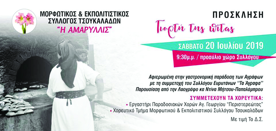Μια ακόμα ευκαιρία για τον Σύλλογο Ευρυτάνων Επαρχίας Λιβαδειάς “Τα Άγραφα”, για να αναδείξουν την πολιτιστική κληρονομιά της Ευρυτανίας. Ο Σύλλογός θα συμμετέχει το Σάββατο 20 Ιουλίου στους Τσουκαλάδες Λιβαδειάς και ώρα 9.30 μ.μ. , στη «Γιορτή της πίτας» που διοργανώνει ο Μορφωτικός & Εκπολιτιστικός Σύλλογος Τσουκαλάδων «Η Αμαρυλλίς». Η γιορτή θα είναι αφιερωμένη στη γαστρονομική παράδοση των Αγράφων και τις αυθεντικές γεύσεις του τόπου μας. Πρώτες ύλες, συνταγές, παραδοσιακοί τρόποι μαγειρέματος, οι γεύσεις και οι μυρωδιές των Αγράφων, θα κυριαρχήσουν στην εκδήλωση. Η παρουσίαση της εκδήλωσης θα γίνει από την λαογράφο κα Ντίνα Μίτσου Παπαλάμπρου και στην εκδήλωση θα συμμετέχουν εκτός από την χορευτική ομάδα παραδοσιακών χορών του Συλλόγου, το Εργαστήρι Παραδοσιακών Χορών Αγ. Γεωργίου ‘Περιστερεώτας’ και το Χορευτικό Τμήμα Μορφωτικού & Εκπολιτιστικού Συλλόγου Τσουκαλάδων.