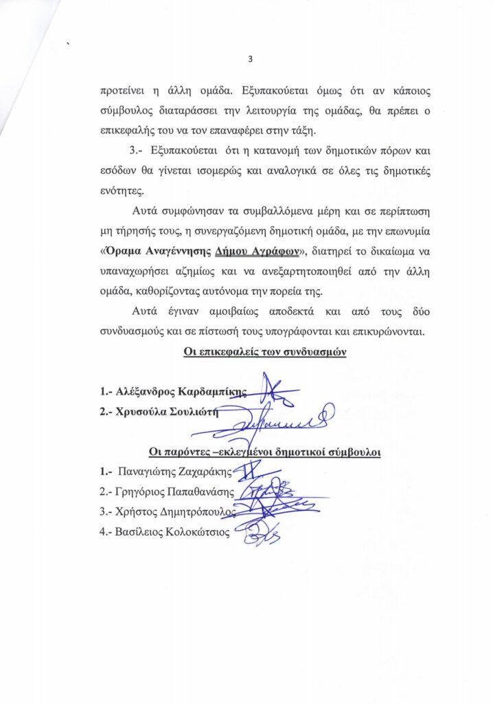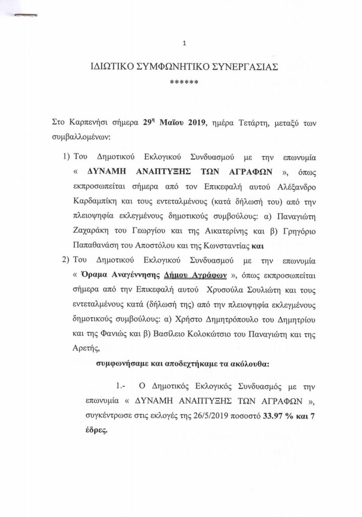 Αυτή η συμφωνία πολιτικής συνεργασίας έδωσε την Νίκη και την θέση του Δημάρχου Αγράφων για την τρέχουσα αυτοδιοικητική περίοδο, στον δήμαρχο Αλέξη Καρδαμπίκη. Η συμφωνία συνεργασίας ανέφερε μεταξύ άλλων ότι: