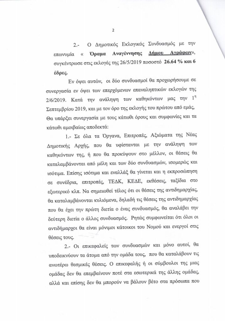 Την 29 Μαϊου 2019 προχωρήσαμε σε μια έγγραφη συμφωνία πολιτικής συνεργασίας, η οποία αποτύπωνε την κοινή βούληση όλων των υποψήφιων δημοτικών συμβούλων του συνδυασμού μας, για συνεργασία υπό όρους. Το συμφωνητικό αυτό υπογράψαμε τόσο εμείς οι επικεφαλείς αλλά και οι δημοτικοί σύμβουλοι της ομάδας του Δημάρχου Παναγιώτης Ζαχαράκης, Γρηγόριος Παπαθανάσης και της ομάδας μου Χρήστος Δημητρόπουλος και Βασίλειος Κολοκώτσιος.