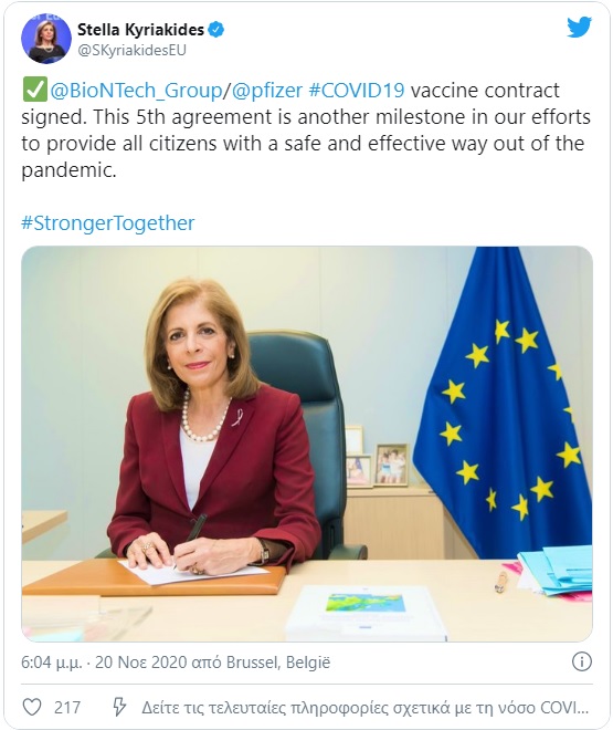 Η Ευρωπαϊκή Ένωση υπέγραψε συμφωνία με την κοινοπραξία BioNTech/Pfizer για τη διάθεση του εμβολίου που παρασκευάζει για την Covid-19, ανακοίνωσε η Επίτροπος Υγείας Στέλλα Κυριακίδου με ανάρτησή της στο Twitter. Έχουν εξασφαλίσει 1,2 δισεκατομμύρια δόσεις μελλοντικών εμβολίων ως τώρα δήλωσε από την πλευρά της η Ούρσουλα Φον Ντερ Λάιεν.