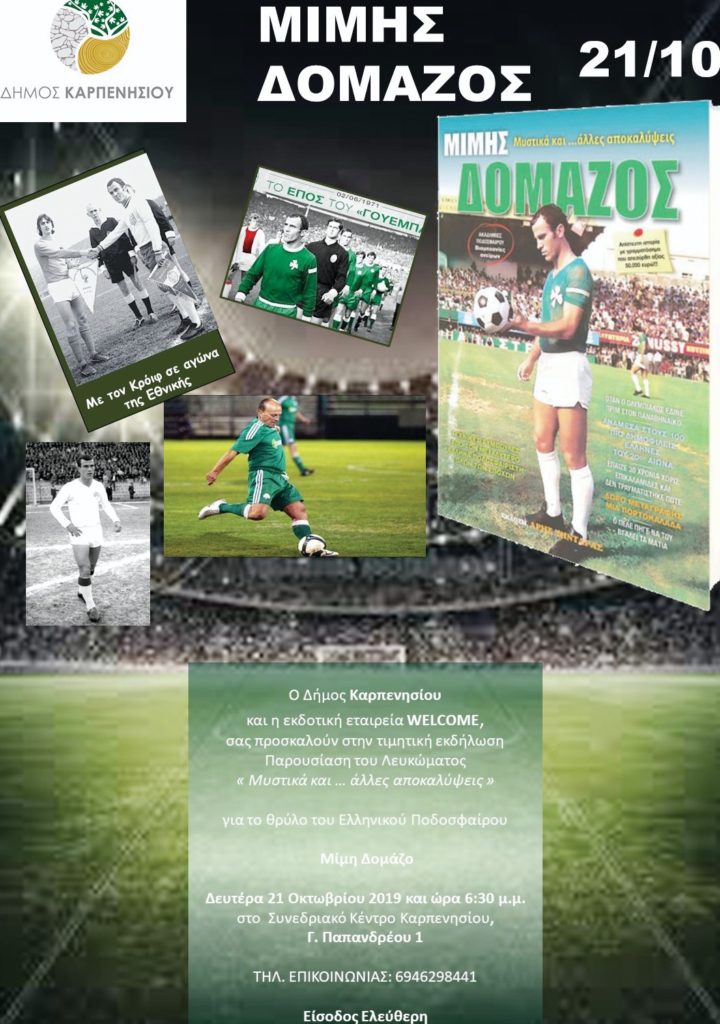 Με αφορμή την κυκλοφορία του λευκώματος του ΜΙΜΗ ΔΟΜΑΖΟΥ, «Μυστικά και …άλλες αποκαλύψεις» ένας από τους μεγαλύτερους Έλληνες ποδοσφαιριστές όλων των εποχών, έρχεται στο Καρπενήσι μετά από πρόσκληση του Δήμου Καρπενησίου. Τιμάται ο Μίμης Δομάζος για την προσφορά του στο ποδόσφαιρο και τον αθλητισμό της χώρας μας, ενώ ο ίδιος θα αναφερθεί τόσο στο λεύκωμα, όσο και σε πολλά άγνωστα γεγονότα της εποχής. Παράλληλα, κατά τη διάρκεια της εκδήλωσης θα προβληθεί και ταινία – αφιέρωμα από τη ζωή του, ενώ ο Μίμης Δομάζος θα έχει την ευκαιρία να μιλήσει και με παλιούς αθλητές παράγοντες, αλλά και φιλάθλους του ποδοσφαίρου|΄Ωρα 18.30 μ.μ.