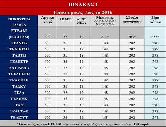 Στον πίνακα 1, αποτυπώνονται οι συντάξεις όπως αυτές είχαν διαμορφωθεί έως τον Μάιο του 2016. Αρχικά είναι τα ταμεία με τις μεγάλες μειώσεις, με το ίδιο αρχικό ποσό σύνταξης, στη συνέχεια οι κρατήσεις και στο τέλος τα μεικτά (προ φόρου) ποσά που ελάμβαναν. Σημειωτέον, οι συντάξεις του ΕΤΕΑΜ είχαν επιπλέον 30% μείωση (Ν.4024) πάνω από τα 150 ευρώ.