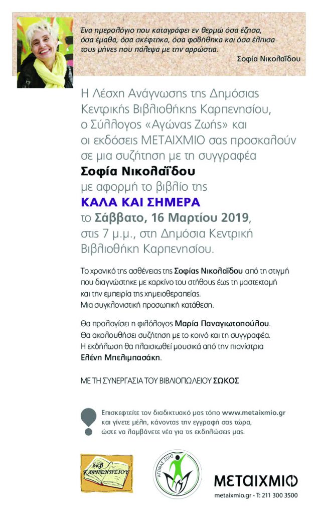 Σάββατο 16/3/2019 στο Καρπενήσι (Κεντρική Βιβλιοθήκη) Βιβλιοπαρουσίαση του νέου βιβλίου της Σοφίας Νικολαΐδου ‘Καλά και σήμερα’, σε συνεργασία με την Λέσχη Ανάγνωσης Καρπενησίου και τις εκδόσεις ‘ΜΕΤΑΙΧΜΙΟ’ | Ώρα 7 μ.μ.