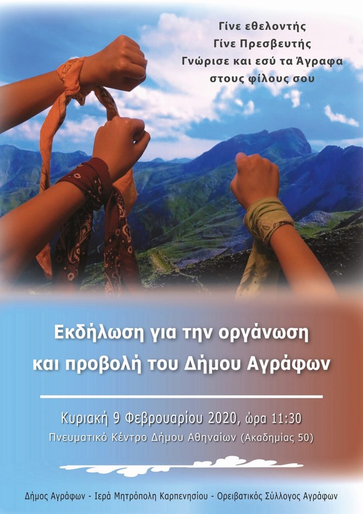 Εκδήλωση για τα Άγραφα. Ο Δήμος Αγράφων, η Ιερά Μητρόπολη Καρπενησίου και ο Ορειβατικός Σύλλογος Αγράφων, συνδιοργανώνουν την εκδήλωση με θέμα: ‘‘Οργάνωση και προβολή του Δήμου Αγράφων’’.