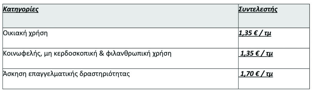 Κατηγορίες Συντελεστής Οικιακή χρήση 1,35 € / τμ