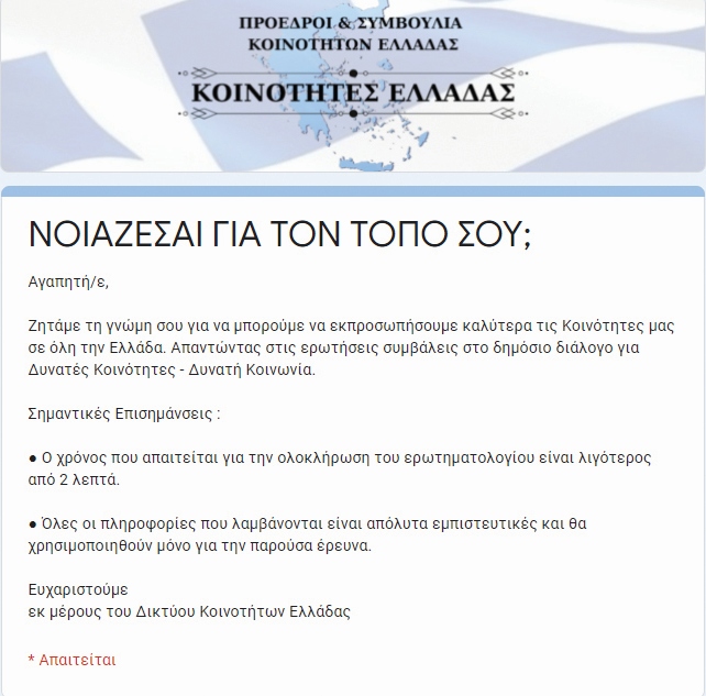 Online βρίσκεται η ηλεκτρονική ψηφοφορία με πρωτοβουλία του δικτύου Κοινοτήτων Ελλάδας, μέλη του οποίου είναι οι Κοινότητες της χώρας, μέσω των Προέδρων και των Τοπικών τους Συμβουλίων. Η ψηφοφορία με τίτλο: ‘Νοιάζεσαι για τον τόπο σου;’, έχει σαν στόχο να καταγράψει την παρούσα συμμετοχή των πολιτών στην τοπική αυτοδιοίκηση, αλλά και τις γνώσεις που έχουν για το θέματα του τόπου τους. ‘Ζητάμε τη γνώμη σας για να μπορούμε να εκπροσωπήσουμε καλύτερα τις κοινότητες μας σε όλη την Ελλάδα. Απαντώντας στις ερωτήσεις συμβάλλετε στο δημόσιο λόγο για δυνατές κοινότητες, δυνατή κοινωνία’, αναφέρει χαρακτηριστικά στην εισαγωγή το δίκτυο.