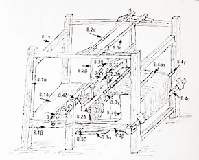 4) Σύστημα στημονιού – σκουτιού που απαρτίζεται από: (8.4α) μπροσάντι, (8.4β) απολυταριά, (8.4γ) πισάντι, (8.4δ) πανάντι ή καβαλάρης, (8.4ε) τανύστρα ή χέρι, (8.4στ) καλαμίδια, (8.4ζ) γκαρδιόβεργα, (8.4η) βαρίδι,και (8.4θ) ξίγκλα .