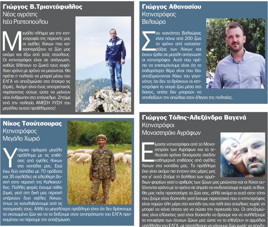 Κτηνοτρόφοι του νομού μιλούν στον Ευρυτανικό Παλμό για τις απώλειες που μετρούν από τις αλλεπάλληλες επιθέσεις λύκων στα κοπάδια τους. Γιώργος Β.Τριαντάφυλλος – Ιτέα Ραπτοπούλου, Γιώργος Αθανασίου – Βελαώρα, Νίκος Τσούτσουρας – Μεγάλο Χωριό, Γιώργος Τόλης-Αλεξάνδρα Βαγενά -Μοναστηράκι Αγράφων.