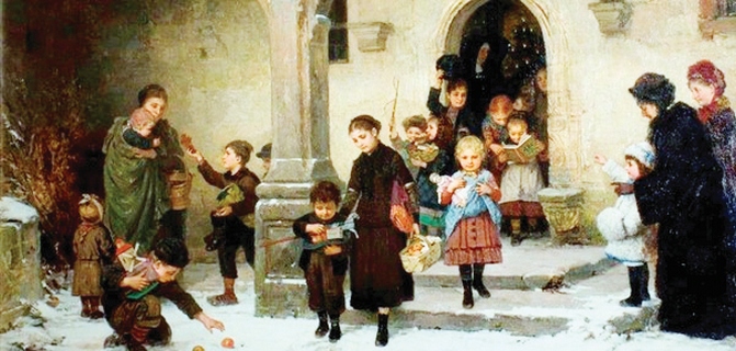 Κρύο τάντανο έκανε, παραμονή Χριστούγεννα. Ο αγέρας σα να ’τανε κρύα φωτιά κι έκαιγε. Μα ο κόσμος ήτανε χαρούμενος, γεμάτος κέφι. Είχε βραδιάσει κι ανάψανε τα φανάρια με το πετρόλαδο. Τα μαγαζιά στο τσαρσί φεγγοβολούσανε, γεμάτα απ᾿ όλα τα καλά. Ο κόσμος μπαινόβγαινε και ψώνιζε· από το ’να το μαγαζί έβγαινε, στ᾿ άλλο έμπαινε. Κι όλοι χαιρετιόντανε και κουβεντιάζανε με γέλια, με χαρές.
