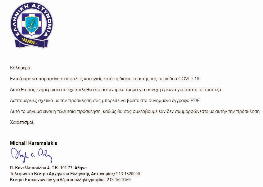 Με ανακοίνωσή της η Ελληνική Αστυνομία και η Διεύθυνση Δίωξης Ηλεκτρονικού Εγκλήματος ενημερώνει τους πολίτες ότι εντοπίστηκε νέο καταφανώς ψευδεπίγραφο – απατηλό μήνυμα, που διακινείται ως δήθεν επιστολή της Ελληνικής Αστυνομίας, μέσω μηνυμάτων ηλεκτρονικού ταχυδρομείου (e-mails), από δράστες που επιχειρούν προφανώς να εξαπατήσουν και να παραπλανήσουν τους πολίτες.