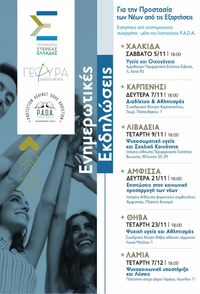 Ο Περιφερειάρχης Στερεάς Ελλάδας Φάνης Σπανός, ο Αντιπεριφερειάρχης Κοινωνικής Μέριμνας Ιωάννης Περγαντάς και ο Αντιστράτηγος ε.α. – Επίτιμος Υπαρχηγός της Ελληνικής Αστυνομίας και Πρόεδρος του Ινστιτούτου P.A.D.A. Αντιναρκωτική Δράση Γιάννης Ραχωβίτσας ανακοίνωσαν τη Δευτέρα 31 Οκτωβρίου 2022, την υλοποίηση σειράς ενημερωτικών εκδηλώσεων για την προστασία των νέων από τις εξαρτήσεις.