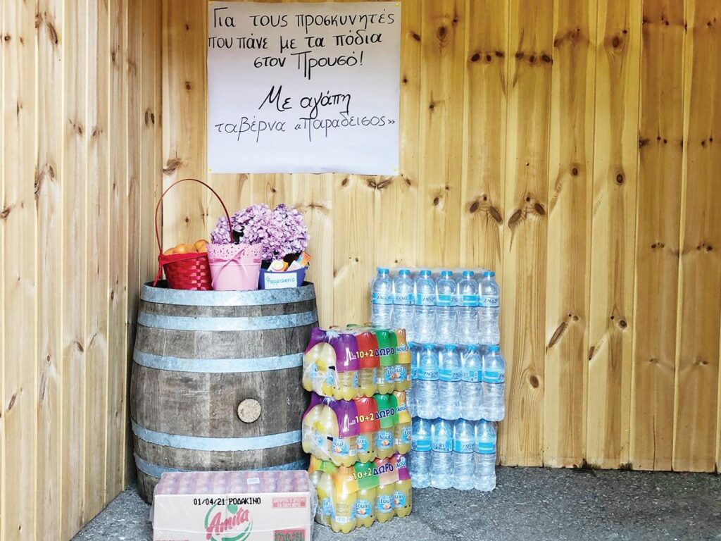 Σε μια συγκινητική κίνηση προσφοράς προχωρά η Διεύθυνση της Ταβέρνας ‘Παράδεισος’ στο Μικρό Χωριό, η οποία θέλοντας να συμβάλει στην ενθάρρυνση των προσκυνητών που περπατούν προς την Ι.Μ. Παναγίας Προυσιωτίσσης, έφτιαξε σταθμό ανεφοδιασμού! Με ανάρτησή τους στα μέσα κοινωνικής δικτύωσης, οι υπεύθυνοι του καταστήματος ενημερώνουν τους προσκυνητές αναφέροντας χαρακτηριστικά: «Τον Αύγουστο αρκετοί προσκυνητές πάνε με τα πόδια στο Μοναστήρι της Προυσιώτισσας! Περνώντας λοιπόν από τον ‘Παράδεισο’ μπορούν να παίρνουν ένα κερασματάκι: χυμό, νερό, καραμελίτσες, φρουτάκι!! Υπάρχει κι ένα μικρό φαρμακείο! Με πολλή αγάπη από την Ταβέρνα Παράδεισος!»