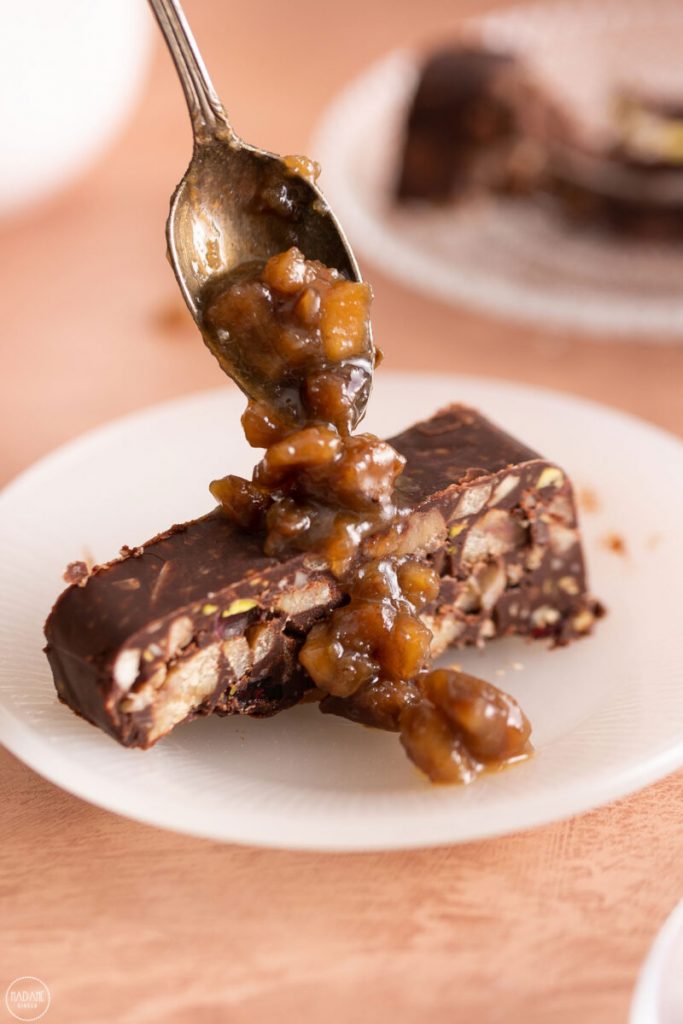 Ετοιμάζουμε το μωσαϊκό. Κομματιάζουμε την κουβερτούρα και τη βάζουμε σε ανοξείδωτο μπολ μαζί με το βούτυρο. Τα λιώνουμε σε μπεν μαρί. Ανακατεύουμε απαλά με μαρίζ και αποσύρουμε από τη φωτιά. Προσθέτουμε στο μπολ τα φιστίκια Αιγίνης, τα αμύγδαλα, τα κάστανα και τα cranberries και τα ενσωματώνουμε απαλά στο μείγμα. Ρίχνουμε το τελικό μείγμα σε μακρόστενη φόρμα περασμένη με λαδόκολλα που να περισσεύει αρκετά στα πλάγια, ισιώνοντας την επιφάνειά του. Διπλώνουμε τη λαδόκολλα που περισσεύει από πάνω και βάζουμε στην κατάψυξη για 3 ώρες. Ετοιμάζουμε τα καραμελωμένα κάστανα. Σε τηγανάκι ή κατσαρολάκι ζεσταίνουμε το βούτυρο με τη ζάχαρη, το εκχύλισμα βανίλιας και το αλάτι για 2-3 λεπτά μέχρι να λιώσει η ζάχαρη. Μόλις πάρει βράση, προσθέτουμε και τα κάστανα, ανακατεύουμε με ξύλινη κουτάλα ή σπάτουλα για 1-2 λεπτά μέχρι να καλυφθούν όλα τα κάστανα και αποσύρουμε από τη φωτιά. Βγάζουμε από την κατάψυξη και αποθηκεύουμε στο ψυγείο μέχρι το σερβίρισμα. Όταν είμαστε έτοιμοι να σερβίρουμε, μεταφέρουμε το γλυκό με τη βοήθεια της λαδόκολλας σε πιατέλα (ή ξύλο κοπής) και κόβουμε σε φέτες. Σερβίρουμε αμέσως με λίγα καραμελωμένα κάστανα.