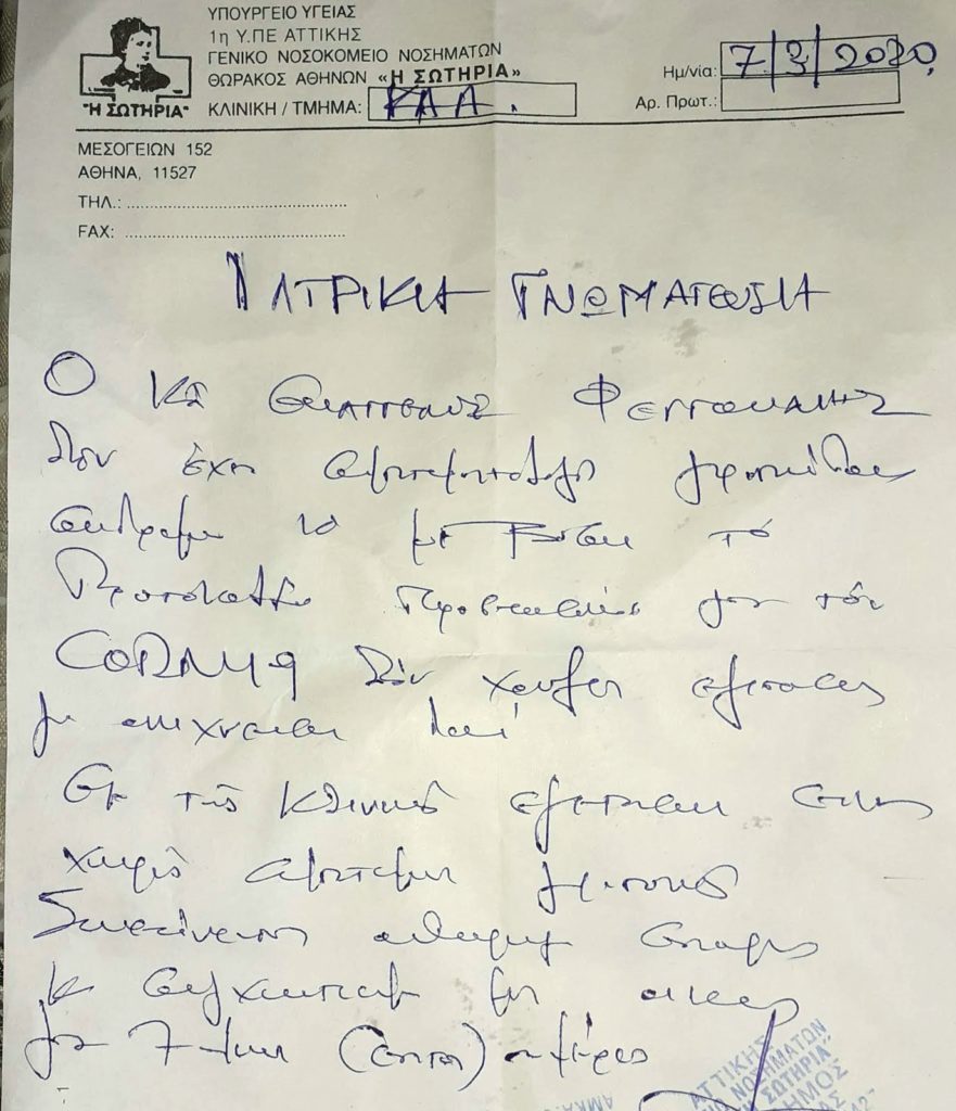 Επιστρέφοντας λοιπόν από το Ισραήλ και μετά από επικοινωνία με τον Διοικητή του Νοσοκομείου Καρπενησίου τον καλό φίλο και Γιατρό Μίμη Καρατσίκη και φυσικά με τον Δεσπότη μου, επισκέφτηκα το Νοσοκομείο ΣΩΤΗΡΙΑ απ’ όπου έλαβα από τον Δ/ντη της ΚΑΑ Ιατρική Γνωμάτευση ότι δεν παρουσιάζω κανένα σύμπτωμα του ιού.