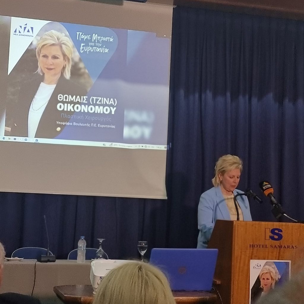Με σύνθημα “Πάμε Μπροστά για την Ευρυτανία” η υποψήφια Βουλευτής Ευρυτανίας για τη ΝΔ, η ιατρός Θωμαΐς (Τζίνα) Οικονόμου, γέμισε την αίθουσα του Ξενοδοχείου ‘Σαμαράς’ καλώντας τους Ευρυτάνες της Φθιώτιδας αλλά και όσους κατέβηκαν από το Καρπενήσι στη Λαμία για τη συγκέντρωση, να ενώσουν μαζί της όλες τις δυνάμεις για μια νέα Ευρυτανία.