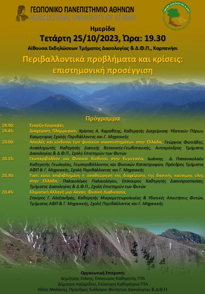 Τετάρτη 25 Οκτωβρίου 2023 Ι ΄Ωρα: 19.30 Καρπενησι, Γεωπονικό Πανεπιστήμιο, Τμήμα Δασολογίας