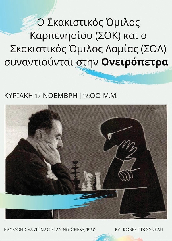 Την Κυριακή 17/11/2019,ώρα 12.00 μ.μ. στο Ξενοδοχείο ‘Ονειρόπετρα’ (Καρπενήσι) Σκακιστικός Αγώνας. Ευρυτανικός Παλμός 6 έτη ago Ο Σκακιστικός Όμιλος Καρπενησίου (ΣΟΚ) συναντιέται με τον Σκακιστικό Όμιλο Λαμίας (ΣΟΛ) μια μέρα αφιερωμένη στο σκάκι