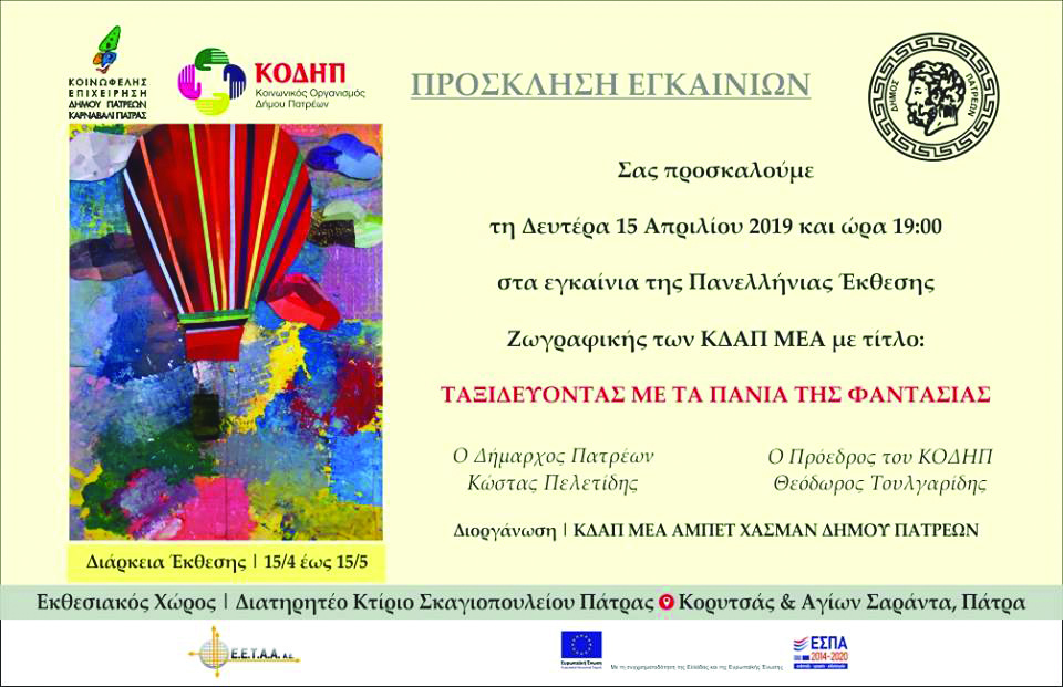 Δευτέρα 15/4/2019 στην Πάτρα (Σκαγιοπούλειο) θα πραγματοποιηθεί Έκθεση Ζωγραφικής ‘ΤΑΞΙΔΕΥΟΝΤΑΣ ΜΕ ΤΑ ΠΑΝΙΑ ΤΗΣ ΦΑΝΤΑΣΙΑΣ’ με τη συμμετοχή του ΚΔΑΠ ΜΕΑ Καρπενησίου (σελ. 21) | Διάρκεια έως 15/5/2019