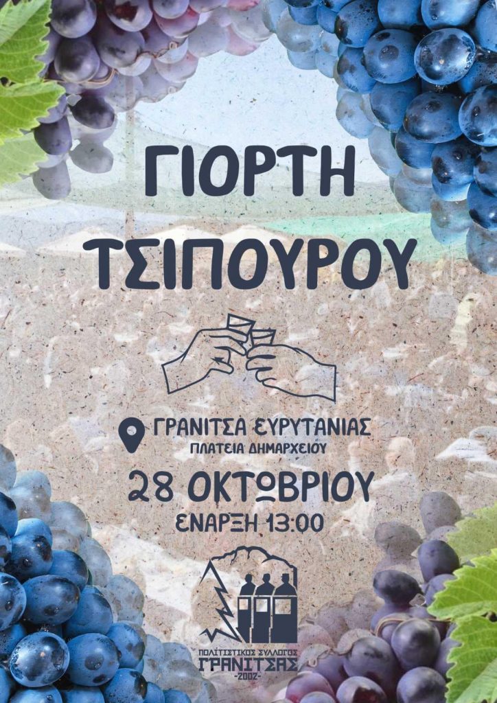 Η καθιερωμένη γιορτή τσίπουρου της Γρανίτσας επανέρχεται το Σάββατο 28 Οκτωβρίου 2023 στις 13.00 το μεσημέρι. Όπως κάθε χρόνο η Γιορτή θα έχει γλέντι, χορό και άφθονο τσίπουρο και την μοναδική φιλοξενία του Πολιτιστικού Συλλόγου Γρανίτσας.