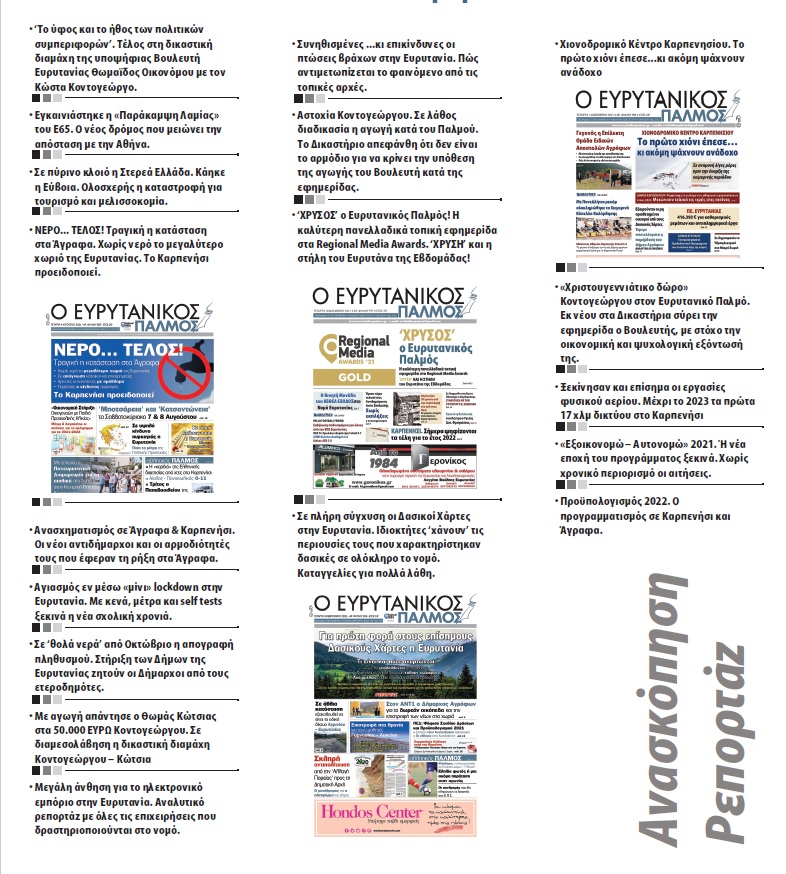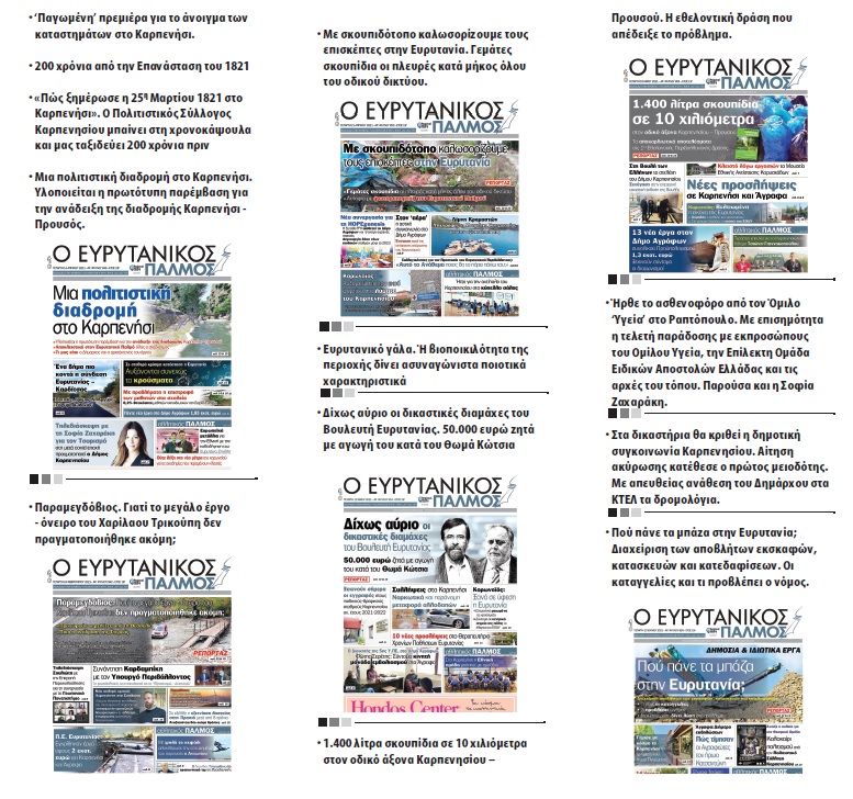Μέσα από 30 ρεπορτάζ ο Ευρυτανικός Παλμός αποτύπωσε σφαιρικά και με ενδελεχή έρευνα τα θέματα που απασχολούν τους Ευρυτάνες, αναδεικνύοντας τα προβλήματα που υπάρχουν σε ολόκληρο το νομό εδώ και χρόνια αλλά και τα θετικά της Ευρυτανίας και πώς αυτά μπορούν να αξιοποιηθούν.