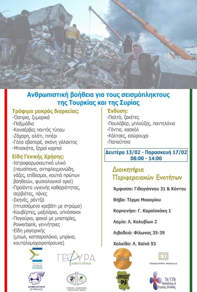 Η Περιφέρεια Στερεάς Ελλάδας, μαζί με την 5η Υγειονομική Περιφέρεια Θεσσαλίας – Στερεάς Ελλάδας και τα Επιμελητήρια της Στερεάς Ελλάδας ξεκινάει εκστρατεία για την αποστολή ανθρωπιστικής βοήθειας στους σεισμόπληκτους της νότιας Τουρκίας και της βόρειας Συρίας.