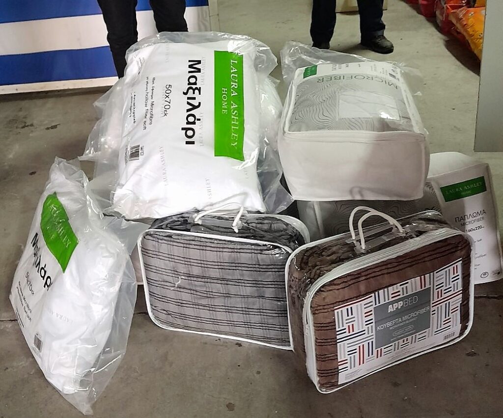Είδη Γενικής Χρήσης: “KIT” ατομικής υγιεινής για γυναίκες, ιατροφαρμακευτικό υλικό (παυσίπονα, αντιφλεγμονώδη, γάζες, επίδεσμοι, κουτιά πρώτων βοηθειών, φυσιολογικοί οροί), πάνες, σκηνές, ράντζα (πτυσσόμενα κρεβάτια με στρώμα), κουβέρτες, μαξιλάρια, υπνόσακοι, παγούρια, φακοί με μπαταρίες, powerbanks, είδη μαγειρικής (μπώλ, κατσαρολάκια, μπρίκια, κουταλομαχαιροπίρουνα).