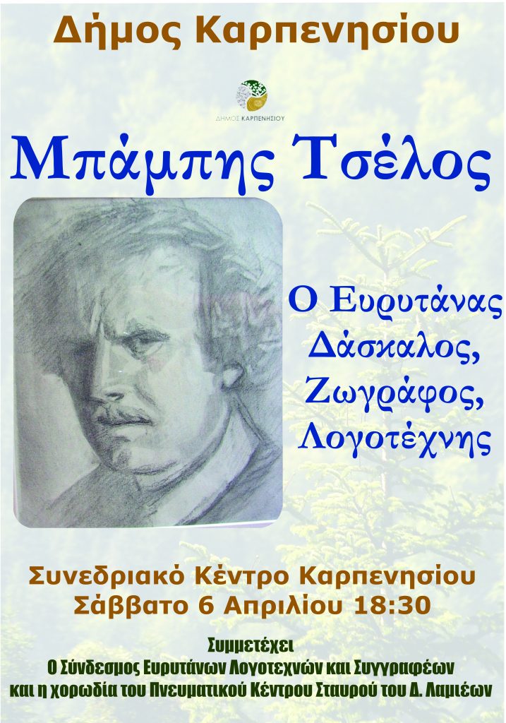 Σάββατο 6/4/2019 στο Καρπενήσι (Συνεδριακό Κέντρο)θα πραγματοποιηθεί Αφιέρωμα. Ο Δήμος Καρπενησίου, με τη συνδρομή του Συνδέσμου Ευρυτάνων Λογοτεχνών και Συγγραφέων, διοργανώνει σε ένα αφιέρωμα στο έργο του μεγάλου, Ευρυτάνα, Δάσκαλου, Ζωγράφου και Λογοτέχνη, Μπάμπη Τσέλου. Παρουσίαση: Εύα Κουνιάρη, Κωνσταντία Μπέικου. Συμμετέχει η χορωδία του Πνευματικού Κέντρου Σταυρού Δήμου Λαμιέων | Ώρα 18.30 μ.μ.