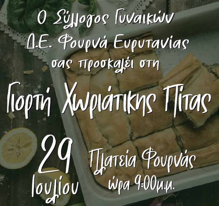 Ακόμα μία γιορτή για την τοπική παράδοση θα πραγματοποιηθεί το Σάββατο 29 Ιουλίου και ώρα 9:00 μ.μ.. στη Φουρνά. Η Γιορτή Χωριάτικης Πίτας, που για ακόμα μια χρονιά διοργανώνει ο Σύλλογος Γυναικών Δ.Ε. Φουρνάς. Μια μεγάλη γαστρονομική γιορτή στην πλατεία του χωριού, με νόστιμες πίτες που γίνονται με παραδοσιακό τρόπο παρασκευής και γλυκά που θα κεραστούν σε όλους. Θα υπάρχει ζωντανή παραδοσιακή μουσική, που θα διασκεδάσει τους παρευρισκομένους ντόπιους και τους επισκέπτες. Στο τραγούδι θα είναι ο Νίκος Βλαχοδήμος, η Γλυκερία Κωστούλα και ο Νίκος Αρβανίτης, ενώ στο κλαρίνο θα είναι ο Γιάννης Καραστάμος. Η γιορτή θα πραγματοποιηθεί σε συνδιοργάνωση του Δήμου Καρπενησίου, του ΟΠΑΣΤΕ και της Π.Ε Ευρυτανίας, αλλά και με την υποστήριξη του συλλόγου Φουρνιωτών Ευρυτανίας «Ο Λεπενιώτης».