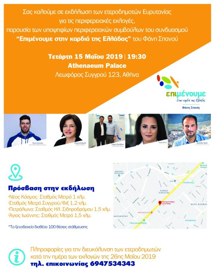 Τετάρτη 15/5/2019 Αθήνα (Athenaeum Palace) Εκδήλωση ετεροδημοτών Ευρυτανίας από τον συνδυασμού του Φάνη Σπανού ‘Επιμένουμε στην καρδιά της Ελλάδας’ | Ώρα 19.30 μ.μ.
