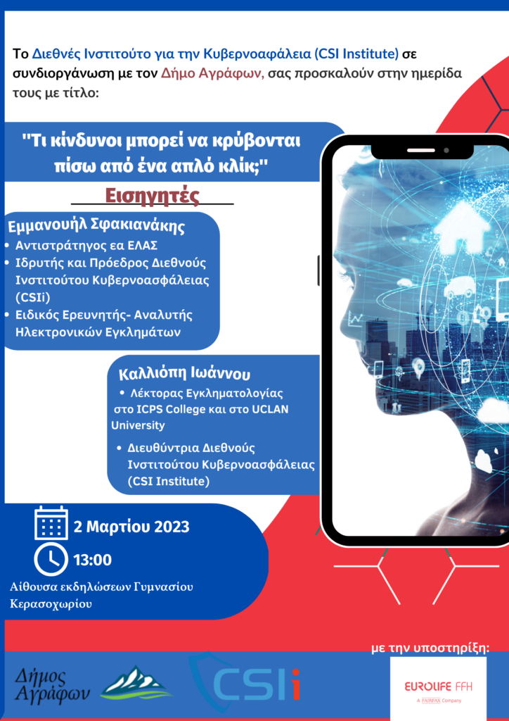 Ο Δήμος Αγράφων σε συνεργασία με το Διεθνές Ινστιτούτο για την Κυβερνοασφάλεια (CSIInstitute) με Πρόεδρο τον κ. Μανώλη Σφακιανάκη, διοργανώνει δράσεις με σκοπό την πρόληψη και την αντιμετώπιση θεμάτων ασφαλείας στο διαδίκτυο.