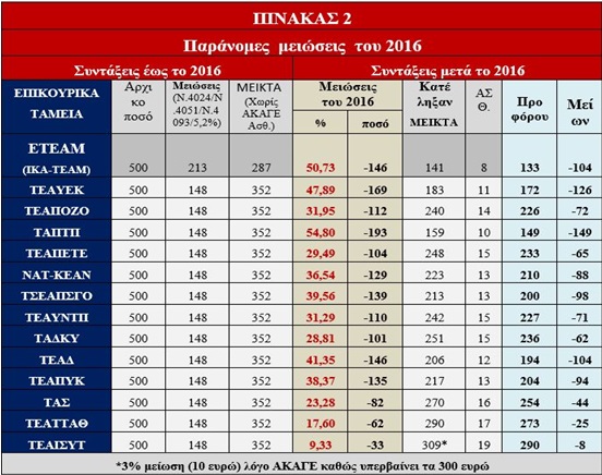 Στον πίνακα 2, φαίνονται τα ποσά των μειώσεων του 2016, αλλά και οι συντελεστές που χρησιμοποιήθηκαν για κάθε ταμείο. Επισημαίνουμε ότι τα ποσά στα οποία έγιναν οι μειώσεις ήταν τα ΜΕΙΚΤΑ χωρίς το ΑΚΑΓΕ & ασθένειας. Έτσι στο πρώτο μέρος είναι οι συντάξεις έως το 2016 με τα αντίστοιχα μεικτά, ενώ στο δεύτερο μέρος οι συντελεστές μείωσης με τα αντίστοιχα ποσά και στησυνέχεια τα εναπομείναντα ποσά μετά το 2016.