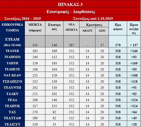 Παρατηρήσεις: Όπως φαίνεται και στον πίνακα οι συντάξεις επανήλθαν στα ίδια επίπεδα, πριν από τις μειώσεις του 2016. Τα (προ φόρου) ποσά σε σχέση με τον ΠΙΝΑΚΑ1. Είναι προσαυξημένα κατά 20 ευρώ, ενώ του ΕΤΕΑΜ κατά 33 ευρώ λόγω διόρθωσης του ΑΚΑΓΕ. Καθώς και οι επιστροφές (σε σχέση με τον ΠΙΝΑΚΑ 2) είναι προσαυξημένες το ίδιο.
