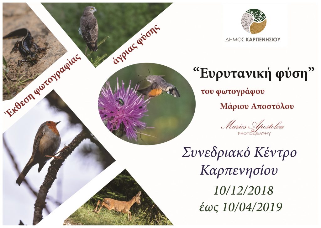 Aπό 12/12/2018 έως 10/4/2019 στο Συνεδριακό Κέντρο Καρπενησίου θα πραγματοποιηθεί Έκθεση φωτογραφίας άγριας φύσης με θέμα “Ευρυτανική Φύση” του φωτογράφου Μάριου Αποστόλου.