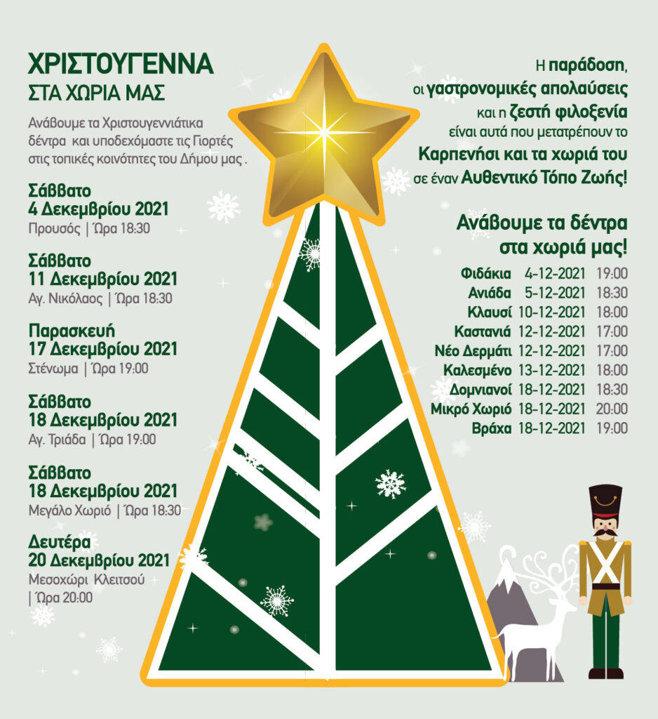 Την Κυριακή 26 Δεκεμβρίου στην κεντρική πλατεία Καρπενησίου στις 12.00 το μεσημέρι ο Σύλλογος Γυναικών Ευρυτανίας και φέτος γλυκό- πλάθει. Πρωταγωνιστές της ημέρας οι μικροί φίλοι του Δήμου που θα παρασκευάσουν μάφινς και cupcakes με τη βοήθεια του γυναικών του συλλόγου. Τη Δευτέρα 27 Δεκεμβρίου Στη σκηνή του Συνεδριακού Κέντρου Καρπενησίου, θα κερδίσει μικρούς και μεγάλους φίλους του θεάτρου, η θεατρική παράσταση ‘‘Χριστουγεννιάτικη ιστορία του Καρόλου Ντίκενς’’. Μία υπέροχη χριστουγεννιάτικη ιστορία με τον τσιγκούνη πλούσιο και τσιγκούνη Σκρούτζ που θα μάθει για το πνεύμα της αγάπης μέσα από τα πνεύματα των Χριστουγέννων. Στο ρόλο του Σκρούτζ ο Νίκος Ορφανός και μαζί του δεκαμελής θιάσους που θα ταξιδέψει το κοινό στο πνεύμα των Χριστουγέννων. Οι εκδηλώσεις ολοκληρώνονται την Παρασκευή 31 Δεκεμβρίου 2021, ξανά στο Συνεδριακό Κέντρο Καρπενησίου ‘‘Με τα μαγικά παιχνίδια του Άγιου Βασίλη’’ την παραμονή της Πρωτοχρονιάς που είναι αφιερωμένη στους μικρούς φίλους του δήμου. Τα ξωτικά φτιάχνουν στο εργαστήρι τα δώρα των παιδιών, αλλά τα πειραχτήρια ξωτικά προτιμούν να στήσουν τη δική τους γιορτή προσκαλώντας μικρούς και για μεγάλους στην ατμόσφαιρα των Χριστουγέννων. Ο Δήμος Καρπενησίου θα προσφέρει στα παιδιά δώρα και γλυκίσματα αποχαιρετώντας τη χρονιά που φεύγει.