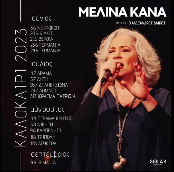Ειδικότερα, με πρωτοβουλία των του Συλλόγου Εθελοντών κατά των Νεοπλασματικών Ασθενειών “Αγώνας Ζωής” , η Μελίνα Κανά θα τραγουδήσει στο Αμφιθέατρο της Κεντρικής Βιβλιοθήκης Καρπενησίου την Τετάρτη 9 Αυγούστου 2023.