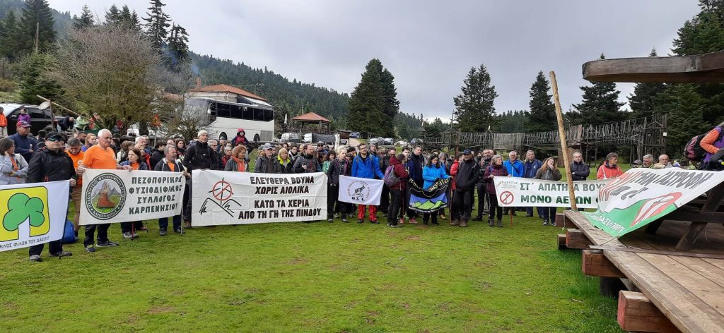Ακόμα μια φορά διατρανώθηκε από τους πεζοπόρους της ΠΟΡΕΙΑΣ ΑΛΛΗΛΕΓΓΥΗΣ:οι αρμόδιοι φορείς και η κυβέρνηση να σταματήσουν επιτέλους αυτά τα σχέδιακαι να μην προχωρήσει το έγκλημα! Δεν αρκούν οι διακηρύξεις για την προστασία του περιβάλλοντος και την κλιματική αλλαγή. Θεωρούμετο αποτέλεσμα των εγκαταστάσεων με τα συνοδάτους έργα σ’ αυτά τα υψόμετρα (δρόμοι πρόσβασης, κτίρια, πυλώνες, κόψιμο δέντρων, σκυρόδεμα, ανεμογεννήτριες) είναι λιγότερο «πράσινο» από το αντιστάθμισμα της παραγόμενης «καθαρής ενέργειας»».