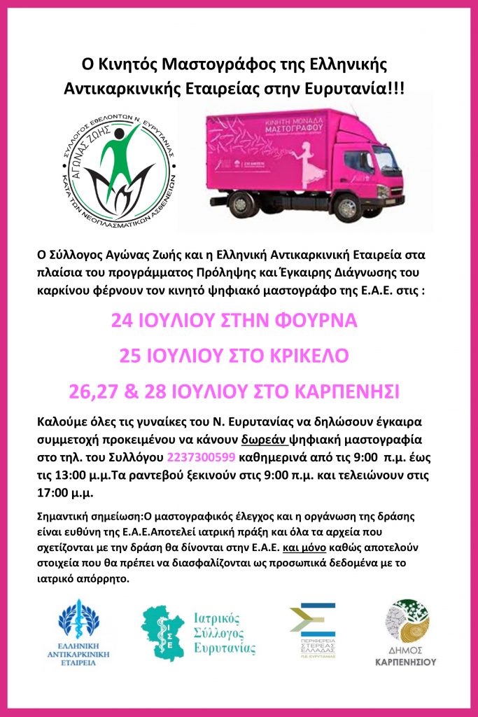 Ο Σύλλογος ‘Αγώνας Ζωής’ και η Ελληνική Αντικαρκινική Εταιρεία στα πλαίσια της έγκαιρης διάγνωσης φέρνουν κινητή μονάδα ψηφιακού μαστογράφου στο Καρπενήσι, τη Φουρνά και το Κρίκελλο προκειμένου οι γυναίκες της περιοχής να κάνουν δωρεάν μαστογραφίες στις 24 έως και 26 Ιουλίου 2023.