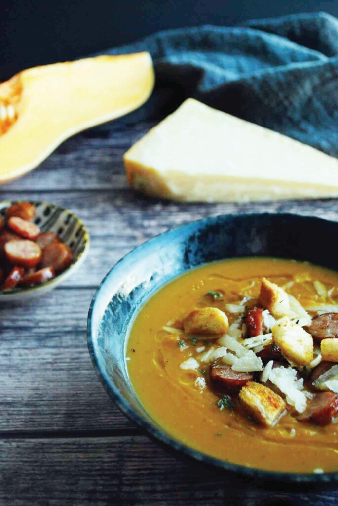 Προθερμαίνουμε το φούρνο στους 200 °C. Κόβουμε την κολοκύθα σε φέτες σαν το πεπόνι. Δεν την ξεφλουδίζουμε. Κόβουμε τις πιπεριές και τα κρεμμύδια σε μεγάλα κομμάτια. Στρώνουμε σε ένα ταψί μία λαδόκολα και τοποθετούμε μέσα τα λαχανικά. Καθαρίζουμε και προσθέτουμε και το σκόρδο. Ρίχνουμε πάνω στα λαχανικά το ελαιόλαδο και το θυμάρι. Ανακατεύουμε καλά. Ψήνουμε για περίπου 35 λεπτά. Μόλις τα λαχανικά πάρουν χρώμα (δεν θέλουμε να καούν) βγάζουμε από το φούρνο και καθαρίζουμε τις φέτες της κολοκύθας, κόβοντάς τες σε μικρότερα κομμάτια. Σε μία κατσαρόλα ρίχνουμε τα λουκάνικα κομμένα σε ροδέλες, μέχρι να πάρουν χρώμα. Τα αποσύρουμε από την φωτιά και στην ίδια κατσαρόλα ρίχνουμε όλα τα λαχανικά από το ταψί. Προσθέτουμε το ζωμό και αφήνουμε να βράσει για 10 λεπτά. Δοκιμάζουμε και αν χρειάζεται προσθέτουμε αλάτι και πιπέρι. Σε ένα μπλέντερ (ή με ένα ραβδομπλέντερ) λιώνουμε τα λαχανικά μαζί με το ζωμό, μέχρι να έχουμε ένα απαλή και λεπτή υφή. Αν θέλετε μπορείτε να περάσετε τη σούπα σας από ένα σουρωτήρι, για να γίνει ακόμα πιο βελούδινη. Σερβίρουμε με τα λουκάνικα που ήδη έχουμε ετοιμάζει, με φρεσκοτριμμένη παρμεζάνα και φυσικά με ελαιόλαδο. Αν θέλετε μπορείτε να προσθέσετε κρουτόν.