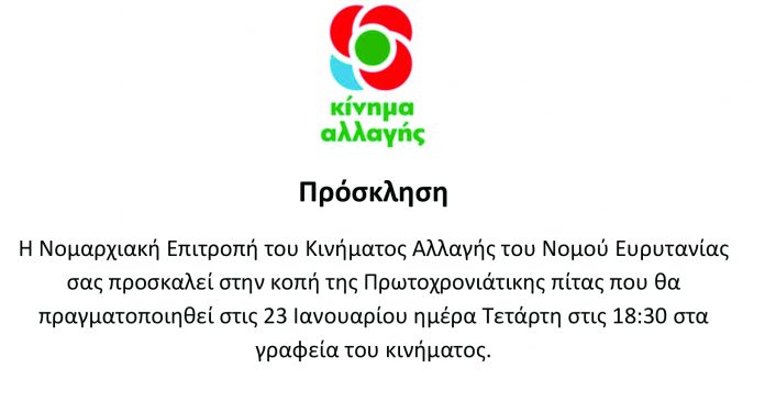 Τετάρτη 23/1/2019 στο Καρπενήσι η Νομαρχιακή Επιτροπή του Κινήματος Αλλαγής του Νομού Ευρυτανίας σας προσκαλεί στην κοπή της Πρωτοχρονιάτικης πίτας που θα πραγματοποιηθεί στα γραφεία του κινήματος | Ώρα 18.30 μ.μ.