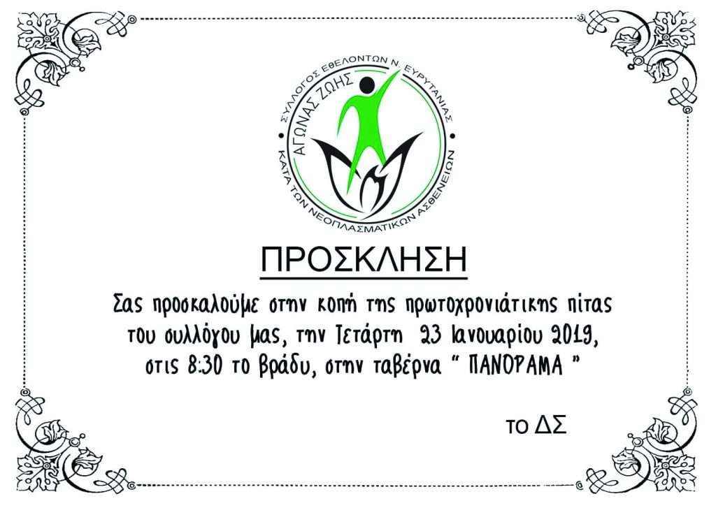 Τετάρτη 23/1/2019 στο Καρπενήσι (Ταβέρνα ‘ΠΑΝΟΡΑΜΑ’) Ο Σύλλογος Εθελοντών κατά των Νεοπλασματικών Ασθενειών Ν. Ευρυτανίας, κόβει και φέτος την πρωτοχρονιάτικη πίτα του | Ώρα 20.30 μ.μ.