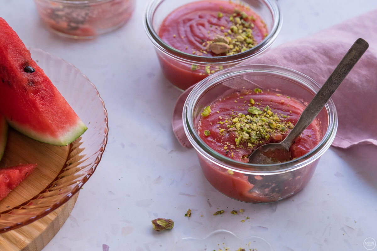 Ξεσποριάζουμε το καρπούζι και το βάζουμε σε μπλέντερ ή επεξεργαστή τροφίμων (σε αυτή την περίπτωση σε δόσεις, λόγω χωρητικότητας). Πολτοποιούμε καλά και περνάμε τον πηχτό χυμό από σουρωτήρι (ή σίτα) μέσα σε δοσομετρητή υγρών, για να τον μετρήσουμε πριν τον χρησιμοποιήσουμε. Ουσιαστικά θέλουμε περίπου 1 λίτρο περασμένου χυμού. Ρίχνουμε τον περασμένο χυμό σε κατσαρόλα και προσθέτουμε το κορν φλάουρ. Ανακατεύουμε πολύ καλά με σύρμα, να διαλυθεί εντελώς το κορν φλάουρ. Προσθέτουμε τη ζάχαρη και την κανέλα και ανακατεύουμε. Βάζουμε την κατσαρόλα σε μέτρια φωτιά και σιγοβράζουμε ανακατεύοντας συνεχώς με το σύρμα, για περίπου 6-10 λεπτά ή μέχρι να πήξει το μείγμα. Αποσύρουμε από τη φωτιά και μοιράζουμε το μείγμα σε ποτηράκια ή μπολάκια. Αφήνουμε να κρυώσουν λίγο και βάζουμε στο ψυγείο για τουλάχιστον 2 ώρες πριν σερβίρουμε. Σερβίρουμε την κρέμα κρύα και αν θέλουμε με λίγο κοπανισμένο φιστίκι Αιγίνης.