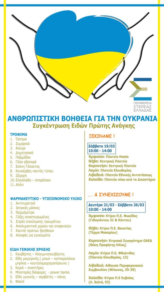 Η σημερινή δράση για την συγκέντρωση ανθρωπιστικής βοήθειας για την Ουκρανία λόγω κακών καιρικών συνθηκών αντί για την Κεντρική Πλατεία θα πραγματοποιηθεί στο παλιό Δημαρχείο στην αίθουσα που στεγάζει την δομή Γέφυρα πάνω από την Κεντρική Πλατεία.