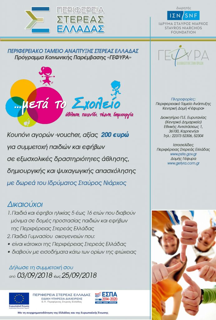 Έως τις 12 Οκτωβρίου 2018, αντίστοιχα, δόθηκε παράταση στην υποβολή αιτήσεων για τη δράση «Μετά το Σχολείο». Η δράση αναφέρεται σε έκτακτη οικονομική ενίσχυση, με κουπόνι αγορών (voucher), αξίας 200 €, για την κάλυψη μέρους ή όλου της ετήσιας συνδρομής για εξωσχολικές δραστηριότητες άθλησης, δημιουργικής και ψυχαγωγικής απασχόλησης.