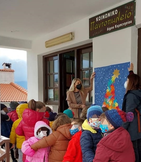 Συνέχεια στις δράσεις κοινωνικής ευαισθησίας με το 1ο Νηπιαγωγείο Καρπενησίου που ‘πλημμύρησε’ με αγάπη, προσφορά και αλληλεγγύη το Κοινωνικό Παντοπωλείο του Δήμου Καρπενησίου! Με σύνθημα: “Η προσφορά είναι στο χέρι μας” οι μικροί μαθητές και οι δάσκαλοί τους επισκέφτηκαν τη δομή του δήμου και πρόσφεραν τρόφιμα. Στη συνέχεια υιοθέτησαν και στόλισαν με χειροποίητα αστέρια ένα χριστουγεννιάτικο δεντράκι στην γιορτινή πλατεία της Νεράιδας. Την προσχολική μονάδα συνόδευσε στις δράσεις τους η υπεύθυνη αντιδήμαρχος Παιδείας κ. Σοφία Ζαλοκώστα.