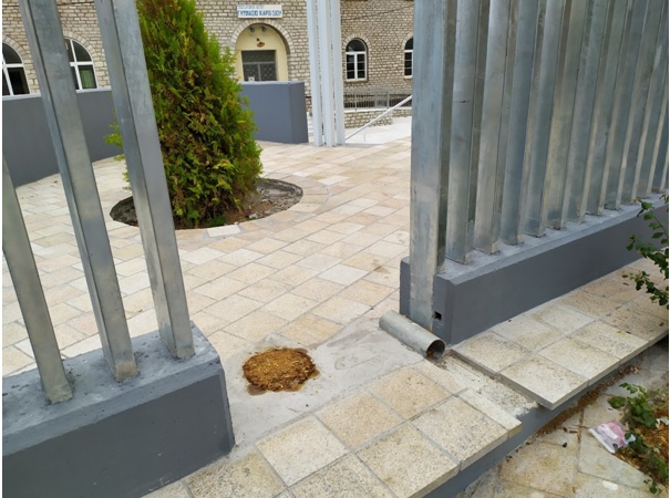 Το πρόπυλο έχει ουσιαστικά ολοκληρωθεί. Ωστόσο απέχει παρασάγγας από το αρχιτεκτονικό σχέδιο που δημοσιοποιήθηκε και εγκρίθηκε. Οι πολύχρωμοι οριζόντιοι κοιλοδοκοί περιέργως έγιναν άσπροι. Τα κάθετα γαλβανισμένα σίδερα αραίωσαν και το σπουδαιότερο, σε ένα σημείο διακόπτονται και στο έδαφος υπάρχει το ίχνος μια κομένης ξύλινης… κολόνας! Προφανώς, μετά την αποκάλυψη ότι το έργο είναι αυθαίρετο και με τον φόβο ότι η Πολεοδομία σε ένα κανονικό κράτος όφειλε να το διακόψει και να διατάξει την κατεδάφισή του, οι αρμόδιοι έσπευσαν να το ολοκληρώσουν «άρπα κόλλα», χωρίς να αναμένουν την απομάκρυνση της κολόνας! (σ.σ.: Τρεις μέρες μετά το άνοιγμα έκλεισε με μια σειρά κάθετα γαλβανισμένα σίδερα!). Και άντε αυτό είναι πταίσμα. Υπάρχει και το έγκλημα: Έψαξα να βρω που βρίσκεται η πρόσβαση των Ατόμων με Αναπηρία. Δεν υπάρχει! Και ο κύριος του έργου και ο χρηματοδότης και ο αρχιτέκτονας και ο εργολάβος περιφρόνησαν τους ανάπηρους μαθητές και συμπολίτες μας. Και μη μου πουν ότι οι ανάπηροι μαθητές θα εισέρχονται στο σχολείο από την… γκαραζόπορτα! Αν η χρηματοδότηση του έργου προέρχεται από κοινοτικά κονδύλια, είμαι περίεργος να δω πως θα αντιμετωπισθεί από τις εποπτεύουσες αρχές αυτό το ζήτημα.