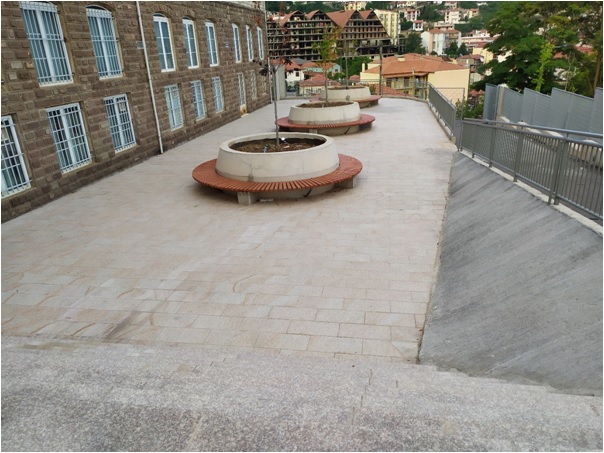 Το προαύλιο και όλη η έκταση έως το αμφιθέατρο της Βιβλιοθήκης είναι στρωμένο με κεραμικά πλακάκια στη χρωματική παλέτα της τερακότας, αταίριαστο με το τοπικό ύφος. Πλακάκια σαν κι αυτά που στρώνονται στις αυλές των ξενοδοχείων και στον περιβάλλοντα χώρο μιας δημόσιας πισίνας. Λες και τα ευρυτανικά βουνά έχουν στερέψει από πέτρες, με τις οποίες σε όλη την Ευρυτανία είναι χτισμένα τα παραδοσιακά σπίτια, οι γραφικές αυλές και οι ξερολιθιές των κήπων. Και άντε να το δεχθούμε, χάριν εκσυγχρονισμού, αν και έτσι δείχνουμε ότι σε αυτή την πόλη στερούμαστε φαντασίας και στρατηγικής για το μέλλον. Σε λίγο δεν θα ξέρουμε γιατί καλούμε τους επισκέπτες μας στην πόλη. Για το περιβάλλον στο οποίο ασελγούμε ασύστολα; Για το παραδοσιακό ορεινό ύφος ή για τις μοντέρνες κατασκευές; Πολύ φοβούμαι για τίποτε από όλα αυτά. Εν πάση περιπτώσει, ας δεχτούμε ότι το τερακότα κεραμικό πλακάκι είναι η κατάλληλη επιλογή και ο χρόνος θα δείξει και την αντοχή τους στις ακραίες καιρικές συνθήκες του χειμώνα. Είμαστε σίγουροι ότι οι τεχνίτες που τα τοποθέτησαν ήταν επαγγελματίες; Και αν ήταν επαγγελματίες μήπως ο εργολάβος δεν τους είχε προμηθεύσει μα αλφάδι και ράμμα; Είμαστε σίγουροι ότι η αρχιτεκτονική μελέτη προέβλεπε άσπρους αρμούς στα κόκκινα πλακάκια; Είναι τόσο άτεχνοι όσοι σχεδίασαν το έργο για να μην προβλέψουν διαφορετικά χρώματα στα πατήματα και διαφορετικά στους ρίχτες; Ποιος θα φέρει την ευθύνη της αποζημίωσης αν σε μια παράσταση ένας θεατής γκρεμοτσακιστεί;