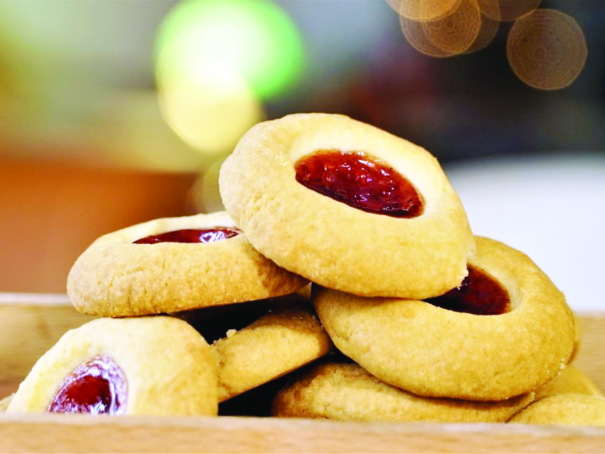Προθερμαίνουμε το φούρνο στους 180 βαθμούς στον αέρα. Ρίχνουμε στον κάδο του μίξερ το βούτυρο, τη ζάχαρη και τα χτυπάμε με το σύρμα σε δυνατή ταχύτητα για 5 λεπτά μέχρι να αφρατέψει το βούτυρο. Χαμηλώνουμε την ταχύτητα στο μέτριο και με ένα κουτάλι της σούπας ρίχνουμε σιγά σιγά το αλεύρι. Μόλις ομογενοποιηθεί το μείγμα, με τη βοήθεια μιας σπάτουλας καθαρίζουμε τα τοιχώματα του κάδου και ανακατεύουμε για ακόμα λίγο. Απλώνουμε λαδόκολλα σε ένα ταψί του φούρνου, φοράμε γάντια μιας χρήσης και πλάθουμε σε μπαλάκια με το μέγεθος τους να είναι όμοιο με ένα καρύδι. Τοποθετούμε τα μπαλάκια στο ταψί αφήνοντας 2 – 3 εκ. απόσταση μεταξύ τους και τον αντίχειρα μας πιέζουμε το κέντρο τους ώστε να δημιουργήσουμε μια μικρή λακουβίτσα. Αδειάζουμε τη μαρμελάδα σε μία σακούλα ζαχαροπλαστικής και γεμίζουμε τα βαθουλώματα των μπισκότων με αυτή. Ψήνουμε για 25 – 30 λεπτά μέχρι να πάρουν ένα απαλό χρυσαφί χρώμα. Μόλις ετοιμαστούν αφήνουμε να κρυώσουν καλά και σερβίρουμε.